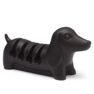 A fun but fully functional cord keeper/organiser that ensures cords do not fall down from desk or bedside table. Dog shaped cord keeper/organiser that clasps and organises up to 4 cords in its flexible grooves (made of rubber and metal). The product is sufficiently weighted so as not fall over.